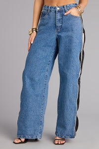 These denim jeans don’t just walk—they strut. The dual-sided zips and contrast paneling bring a moto-meets-street vibe, while the wide-leg cut keeps it effortlessly cool. Complete the vibe with a crop jacket and sneakers.