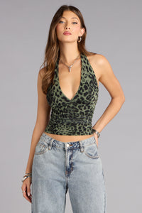 Bring out your bold side. This leopard print mesh halter top serves fierce attitude with a flirty twist—ruched sides, cropped fit, and just the right amount of stretch for your wildest nights out.
