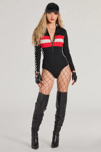 Set hearts racing this Halloween in a racer costume! The bodysuit features a mock neck with a plunging V-neckline with zippered closure, fitted long sleeves with a checkered design, contrasting stripe design at the bust, and cheeky coverage. Complete the costume with fishnet tights and faux leather gloves.