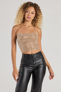 A cropped rhinestone halter top that'll inspire your next going-out look! It features a sultry plunge cowl neckline and a partially open back that turns heads. Pair with jeans.