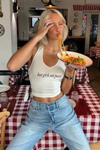 Proof that carbs and confidence go hand in hand. This halter crop top keeps it cheeky with a “hot girls eat pasta” graphic and a fitted vibe that’s ready for your next foodie photo dump.