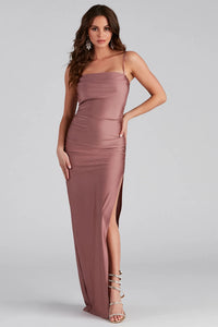 The Marissa long satin dress brings elegance and sultriness to your formal night. The floor-length gown enhances your curves with a fitted bodice and flattering A-line silhouette while the high front slit provides movement.