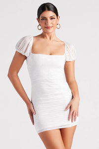 Give off sweet and charming vibes in this adorable lace mini dress! Featuring a square neckline, sheer short puff sleeves, front ruching, a mini-length hem, and a form-hugging fit, this dress is a staple for bridal showers, weekend brunches, or garden parties! The sheer floral lace fabric includes a knit lining. Style with hoop earrings and strappy mules.