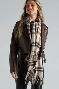 This ever-so-trendy plaid fringe scarf is perfect for the cold season ahead! Wrap yourself up in this comfy and ultra-soft scarf for day or night plans. Complete the look in a trendy moto jacket.