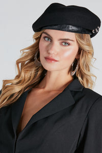 Dress to impress with a touch of Parisian flair with this rhinestone detail beret. It features a classic beret design crafted from a faux wool material with a sleek faux leather trim and a dainty three-row rhinestone-embellished accent at the side. Style with hoop earrings and stiletto booties for a chic look.