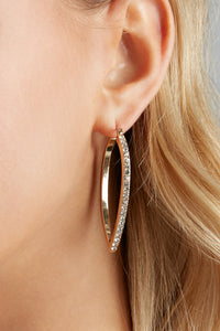 Bring that sleek sparkle to your dressy looks with these gorg rhinestone oval hoop earrings. They feature a medium-sized thin oval-shaped hoop design with sparkling rhinestone embellishments. Includes an omega closure. Complete your formal 'fit with a glitter clutch!