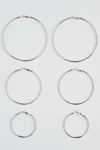 Simple yet classic, finish your look with these three pack hoop earrings! It features three various-sized pairs of sleek hoop earrings each with an omega closure. Style with block heels for any day or night plans!