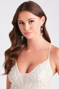 Give off an enchanting sparkle with these radiant rhinestone butterfly duster earrings! They feature a butterfly-shaped post with shimmering rhinestone embellishments leading to a linear drop design of mini rhinestones and matching rhinestone butterfly accents. Style with a glitter knit formal dress for your next special occasion.