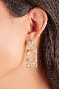 Make your next party a glam affair with these trendy small door-knocker earrings! They feature a round post, a hanging rectangular outline, and a chic textured metal design. Include a post-back closure. Style with a rhinestone choker necklace.