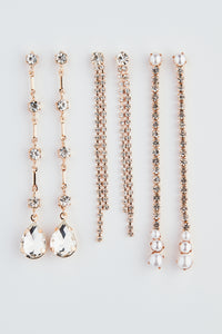 Amp up your looks and radiate trendy glamour with this embellished earring set. It features three pairs of linear duster earrings, one pair with rhinestones and large teardrop rhinestone accents at the bottom, one pair with rhinestone studs leading to two rows of mini rhinestones, and one pair with faux pearl studs, a single row of mini rhinestones, and faux pearl accents at the bottom. Style this set with a dainty necklace.