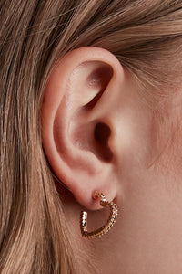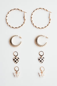 You'll adore styling these charming four-pack earrings set with every outfit! The set features one pair of twisted medium-sized hoops, one pair of checkered heart huggies, one pair of butterfly huggies, and one pair of textured half hoops. Each either has an omega closure or a post-back closure. Complete the look in a trendy cutout tee.