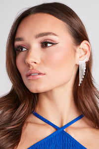 Make it an elegant affair with this dramatic and chic earring set! It features a cuff earring with a curved design, rhinestone embellishments, cascading rhinestone fringe, and a hook closure. The set also includes a single rhinestone stud earring. Style with a sparkly ring pack.
