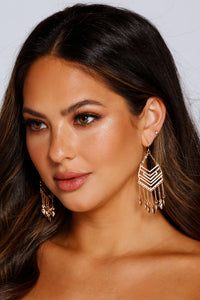 Bring the chic factor to your look with earrings that wow! The earrings feature a multi-row chevron design, mini rhinestones, and a drop coin design. Complete look with a bustier and mini skirt.