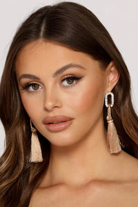 Add some trendy glam vibes to your look with these gorgeous statement earrings. They feature a chain-link design with rhinestone embellishment and a chic tassel detail. Style these earrings with a curve-hugging midi dress and heels.