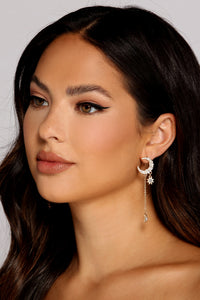 Light up the night with these trendy glam statement earrings. They feature a moon-shaped stud with two star-shaped charms cascading down from chain links at varying lengths. The moon and star designs have rhinestone embellishment for a gorgeous sparkle. Style these earrings with a simple and stunning necklace.