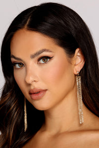 Hey babe! Glam up your look with these luxe statement earrings! They feature three rows of sparkly rhinestones with a dramatic cascading fringe design. Style these earrings with an embellished cuff.