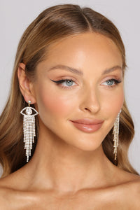 Ward off bad vibes with fringe earrings that keep your look on point! The earring feature a rhinestone stud on post, an evil eye outline embellished with rhinestones, and a multi-tiered fringe. Complete look with a velvet dress and rhinestone heels.