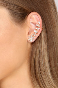 Radiate a stylish glow with ear crawlers that slay your look! The ear crawlers feature a cubic zirconia embellished flower design with a leaf and stem accent. Complete look with a white dress and wedges.