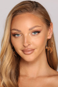 Illuminate your look with starry-inspired hoops! The hoops feature an extra-large sleek metal hoop with rhinestone embellished starburst charms. Complete look with a romper and wedges.
