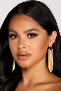 Fall for these fringe earrings that bring the glitz to your outfit! The earrings features a rhinestone stud that leads to a draping U-shaped metal fringe. Complete look with an LBD and heels for your next date night with bae!