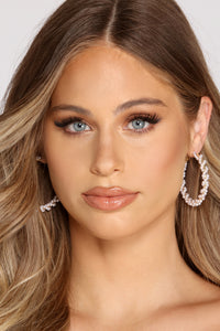 Bring a luxe twist to your look with rhinestone hoops that dazzle! The hoops feature an extra-large hoop embellished with rhinestone and a twisted texture. Complete look with a velvet dress.