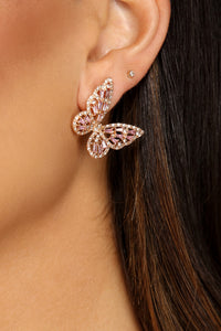 Style up these pretty butterfly stud earrings for a gorgeous look! They feature an intricate butterfly design embellished with rhinestones and pink baguette rhinestones. Pair these earrings with a floral dress and clear heels.