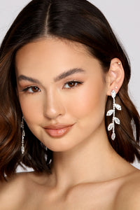 Bring the luxe to your evening outfit with earrings that dazzle from all your best angles! The earrings feature mini rhinestones in a cascading chandelier design set in a leaf-shape. Complete look with a flocked velvet dress and rhinestone heels.