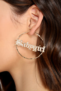 Shine on babygirl with hoops that are part glam, part trendy! The hoops feature a sleek hoop and a rhinestone embellished "Babygirl" script at the center of the hoop. Includes an omega back closure. Complete look with biker shorts and a crop top.