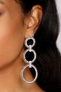 Get linked to these stylish earrings that radiate glamour. The earrings feature a vertical row of triple o-shaped rings, rhinestones, and a post-back closure. Complete look with a formal satin dress.