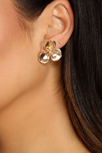 Showcase your effortless beauty in these stunning statement earrings. They feature a matte flower-shaped post connected to a larger matte flower-shaped design, both with gold metal center stud details. Pair these earrings with a skater dress and clear heels for the cutest date outfit.