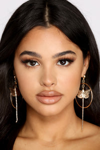 Showcase a dreamy look when you accessorize with these trendy statement earrings! They feature a small round post with a chain-link connected to a filigree detailed butterfly charm and a large sleek hoop. A single row of rhinestones cascades down from the charm. Pair these earrings with a casual dress and strappy sandals to add a gorgeous glow.
