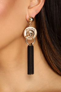 Strike a fierce look with door knockers that are part fierce, part glam. The door knockers feature a ball stud on post, an engraved lion head, and metallic tassels. Complete look with an LBD.