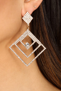 Bring the luxe with rhinestone earrings that dazzle up your look. The earrings feature a small diamond-shape on post that leads to a sleek interlocked multi-square design that is embellished with rhinestones. Complete look with a satin dress.