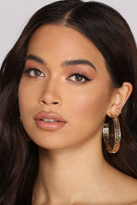 Showcase your glam taste with hoops that are so gorge! The hoops feature an extra-large open-ended design and a Greek key pattern. Includes a post-back closure. Complete the look with a sleeveless sweater dress.