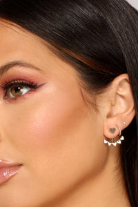 Add on these dainty heart detail stud earrings to make your everyday 'fit all the more adorable! They feature a single heart stud with a connected heart design backing that sits right under the ear. Pair these earrings with a basic tee and denim for a casual and cute look.