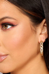 These trendy chain link hoops will add a trendy vibe to your stylish look! They feature a chunky chain link open hoop design with rhinestone detailing. Pair these earrings with a basic bodysuit and layer on a chic blazer for the perf workwear 'fit.