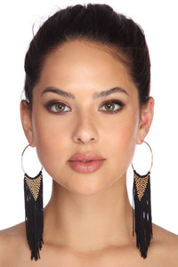 These statement earrings will be the center of attention! They feature gold hoops, long black fringes with gold beading, and an omega closure.
