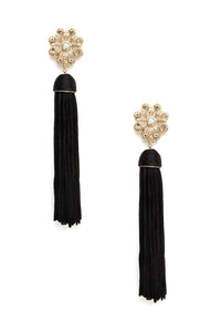 Let your beauty bloom in these gorgeous black earrings! They feature a floral design on post with mini rhinestones and a gold outline. The draping tassles feature a luxe mauve hue to make a chic statement.