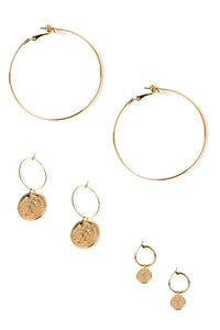 These gold hoop earrings will give you a major glam factor! The set features three pairs, the first a pair of mini hoops with coin accents with engraved details, and the second a bigger pair of thinner hoops with larger coins hanging down with Grecian inspired details. The last pair are basic large thin hoops. Each feature an omega closure.