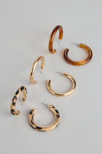 Three moods, one set. This hoop earring trio features gold, tortoiseshell, and leopard finishes for an instantly elevated mix that goes with everything from casual days to night-out slays.
