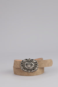 Western vibes, polished finish. This faux leather belt with an etched buckle brings just the right touch of edge to denim, dresses, and everything in between.
