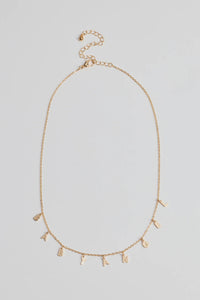 This dainty chain necklace features letter charms that spell out "Baby Angel". Perfect for styling with a mini dress for any occasion.