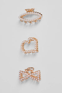 Elevate your tresses with this luxe three pack hair clip set! It features one oval faux pearl embellished hair clip, one faux pearl embellished heart hair clip, and one faux pearl embellished bow hair clip. Complete the look with cute heels for any occasion!