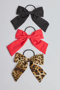 This bow hair tie three-piece set includes two solid colored hair bows and one leopard print hair bow. Perfect for everyday wear.