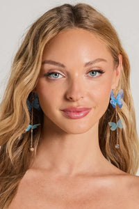 Create an enchanting spring or summer party look with these whimsical butterfly statement earrings! They feature a gorgeous long cascading design with a dainty chain, large and small sheer organza butterfly accents, and a sparkling round rhinestone detail at the end. Include a fish hook closure. Style with a ring set.