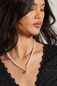 Showcase a pretty glam vibe with this on-trend heart charm pearl necklace. It features a faux pearl beaded design, an O-ring and toggle closure, and an adorable heart charm at the center. Style with hoop earrings.