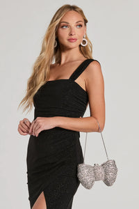 Add the company of this luxurious sparkly clutch to your formal ensemble! This exquisite clutch features a detachable chain strap, top clasp closure, and a rhinestone embellished bow for a touch of elegance. The spacious interior allows you to carry your essentials in style. Complete the look in statement earrings for a black tie affair.