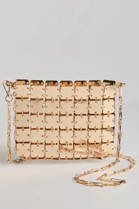 This square chainmail bag features a detachable crossbody strap and a spacious interior for your phone, cash, cards, or keys. Perfect for styling with heels for a night out.