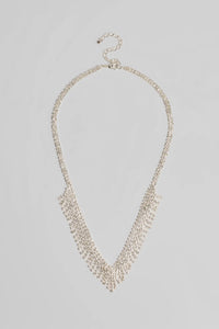 A glam necklace features rhinestone embellishments and a fringe design secured with a lobster clasp closure. Perfect for dressing up your formal wear.