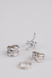 Give your night-out looks a sassy glam vibe with this multi-pack ring set. It features four rings with a chain-link design, asymmetric design, rhinestone-embellished design, and a spiral snake design with mini rhinestones. Style with a sleek clutch.